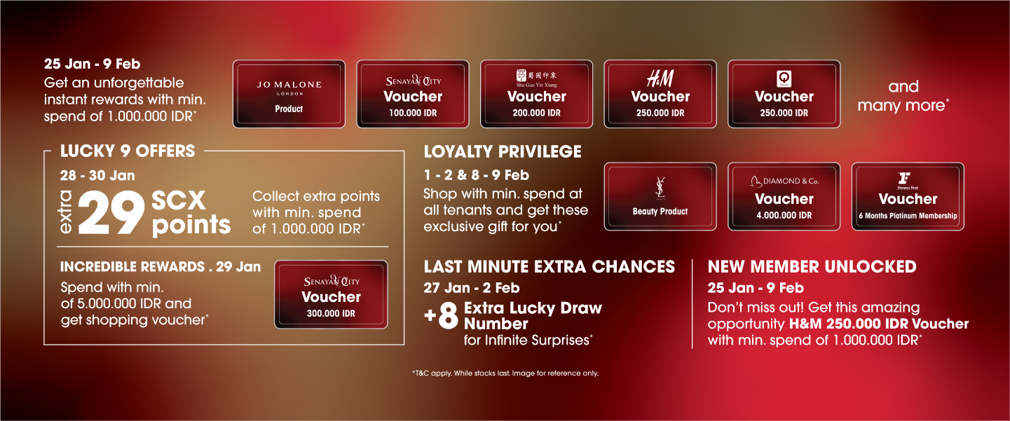 - 10 SCX Existing Member terpilih yang menukarkan struk pembelanjaan di semua tenant (kecuali tenant yang tertera pada ketentuan no.4) pada tanggal 29 Januari 2025 selama periode berlangsung dengan minimal senilai Rp 5.000.000,- (lima juta rupiah) akan mendapatkan hadiah voucher Senayan City senilai Rp 300.000,-.