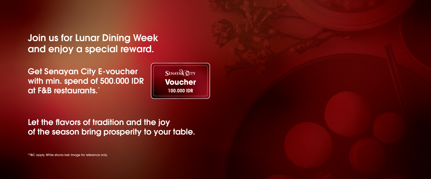 From January 25th to 29th, 2025, with spend a minimum of IDR 500,000 on our F&B Restaurant, and you’ll receive an IDR 100,000 cashback Senayan City e-voucher.