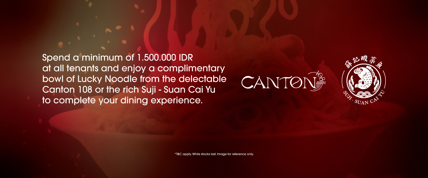 Spend IDR 1.500.000 at all tenant and receive a special gift—a complimentary Lucky Noodle from either Suji Suan Cai Yu or Canton 108.
