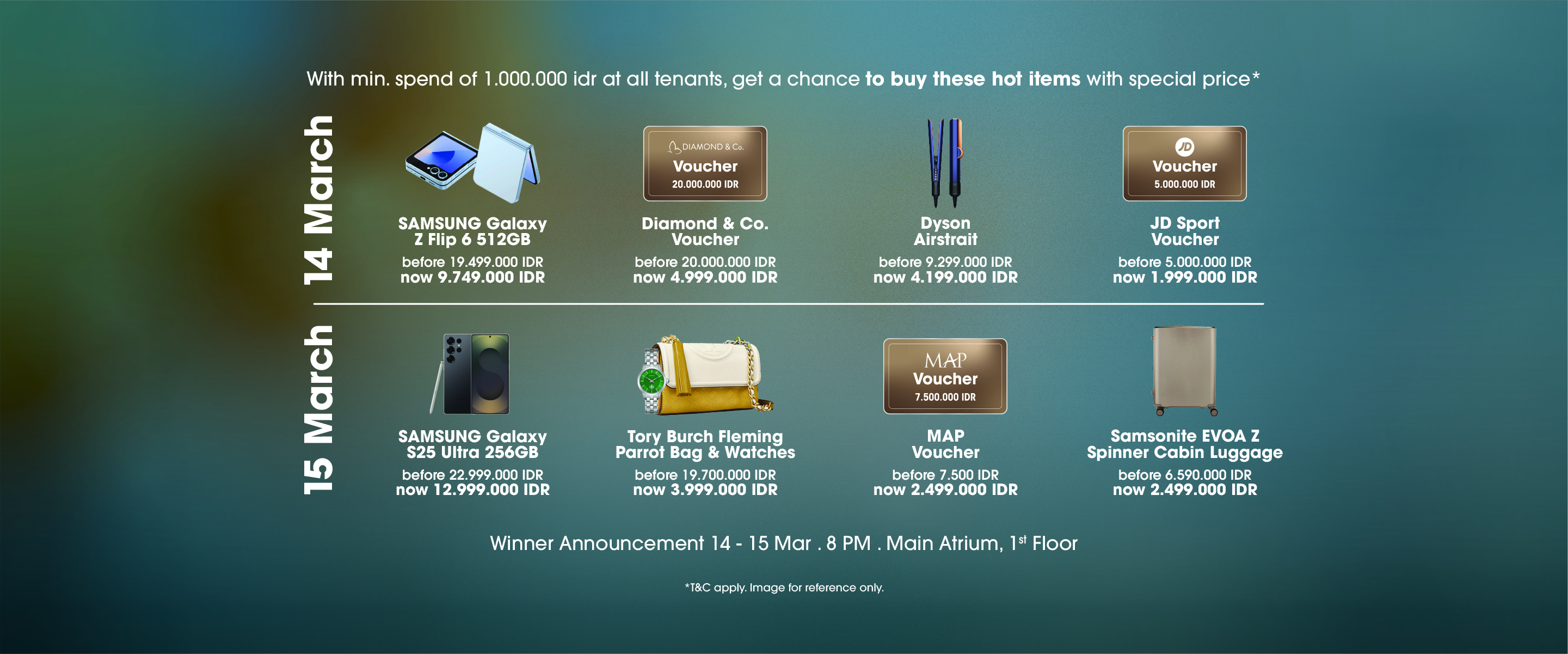 Shop at any tenant with a minimum spend of IDR 1,000,000 and stand a chance to purchase premium items at special prices! From the Samsung Galaxy Z Flip 6 to luxury vouchers, stylish bags, and high-end gadgets—don’t miss this exclusive deal on 14-15 March.