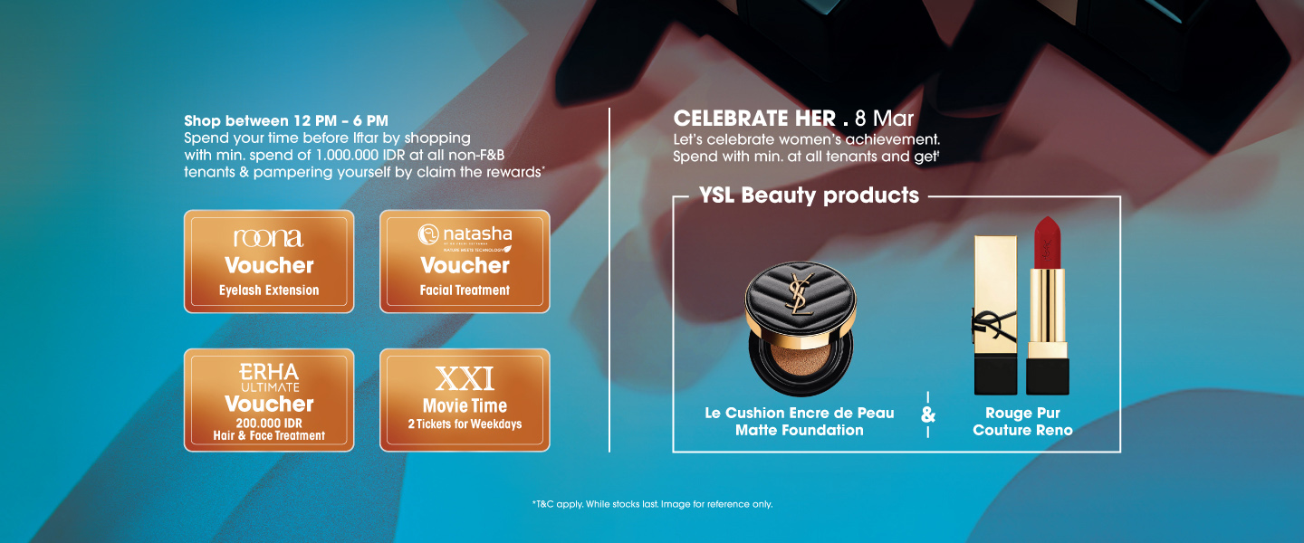 Spend your time before Iftar by shopping with min. spend of 1.000.000 IDR at all tenants (exclude F&B tenants) & pampering yourself by claim the rewards*