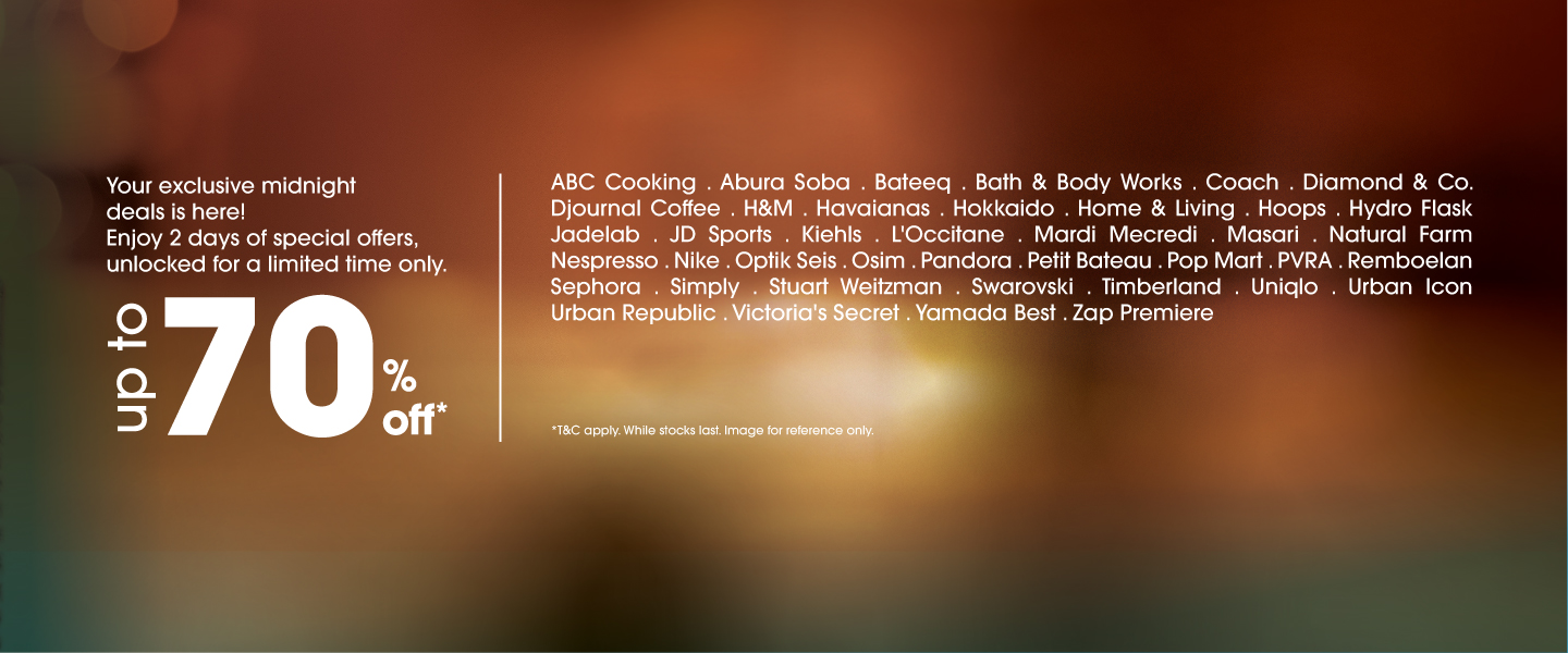 ABC Cooking, Abura Soba, Bateeq, Bath & Body Works, Coach, Diamond & Co., Djournal Coffee, H&M, Havaianas, Hokkaido, Home & Living, Hoops, Hydro Flask, Jadelab, JD Sports, Kiehl’s, L’Occitane, Mardi Mecredi, Masari, Natural Farm, Nespresso, Nike, Optik Seis, Osim, Pandora, Petit Bateau, Pop Mart, PVRA, Remboelan, Sephora, Simply, Stuart Weitzman, Swarovski, Timberland, Uniqlo, Urban Icon, Urban Republic, Victoria’s Secret, Yamada Best, Zap Premiere.