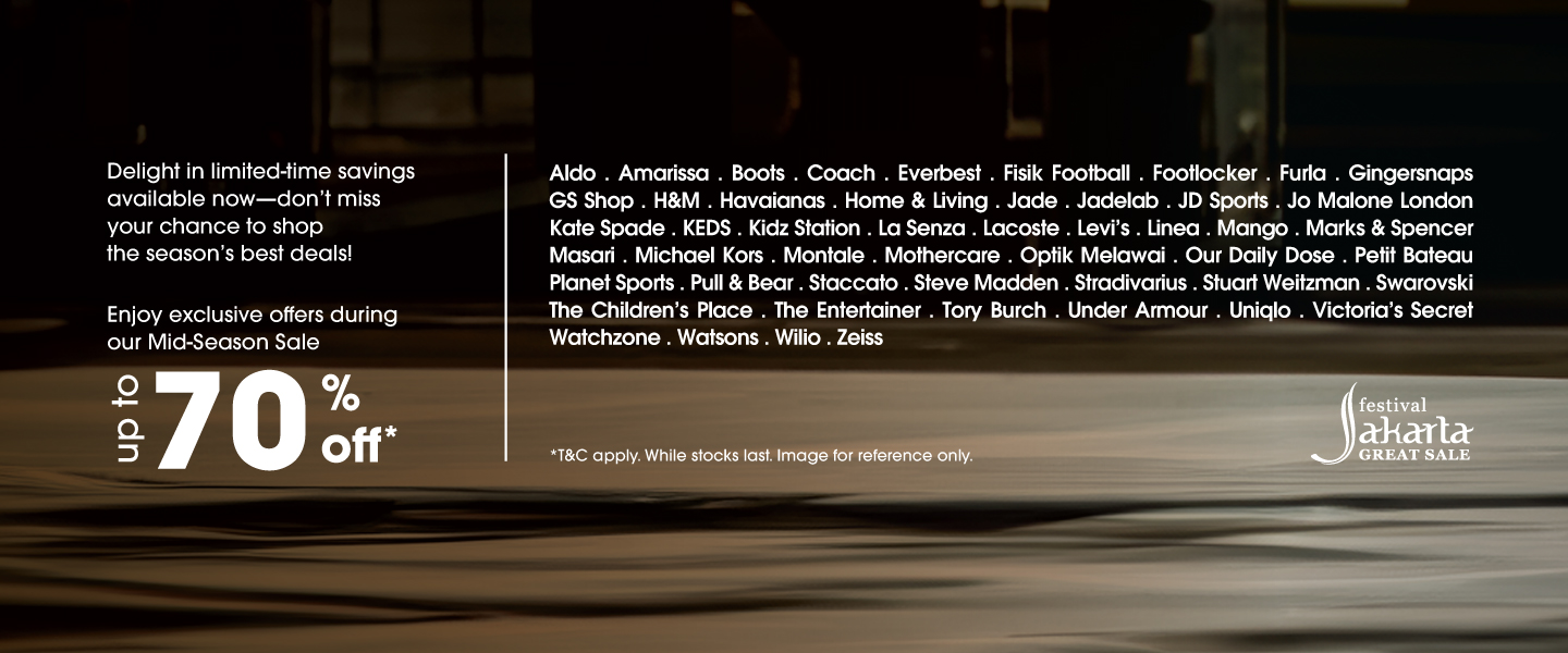 Enjoy up to 70% off during our Mid Season Sale period, now happening together with Festival Jakarta Great Sale. Get the best deals on your favorite items while they last.