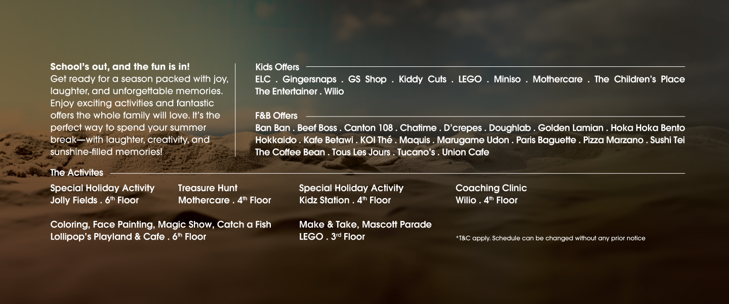 Get ready for a season packed with joy, laughter, and unforgettable memories. Enjoy exclusive promotions and kid-friendly activities designed to make this summer break extra special.