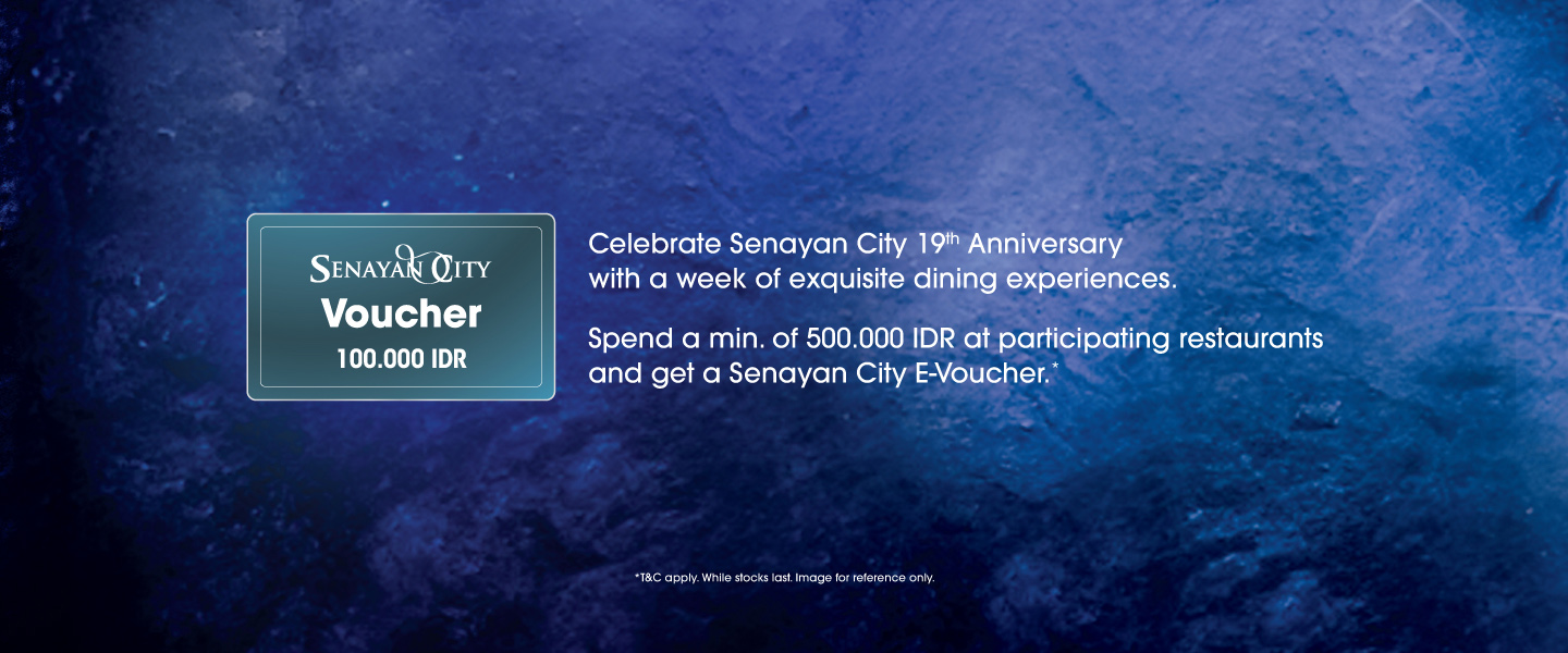 Senayan City celebrates its 19th Anniversary with a week of exquisite dining experiences during Anniversary Dining Week. Dine at participating restaurants, spend a minimum of IDR 500,000, and receive a Senayan City E-Voucher worth IDR 100,000.