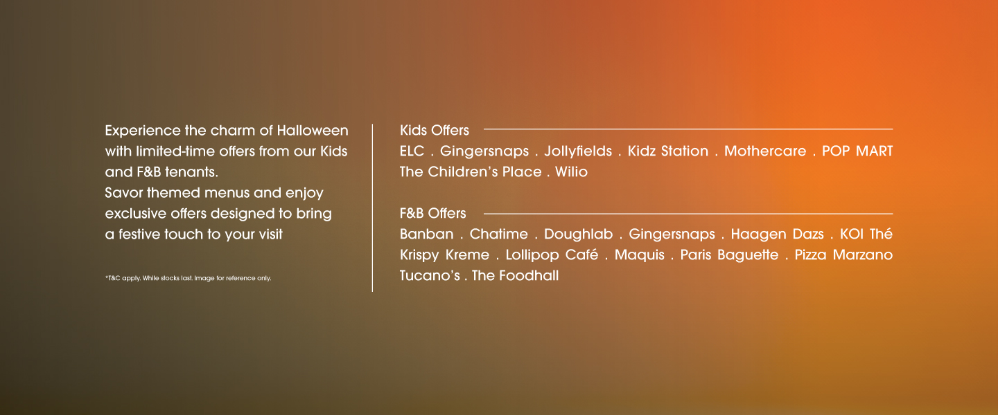 Discover exclusive offers, themed delights, and festive moments with our curated tenants — available until 31 October 2025.