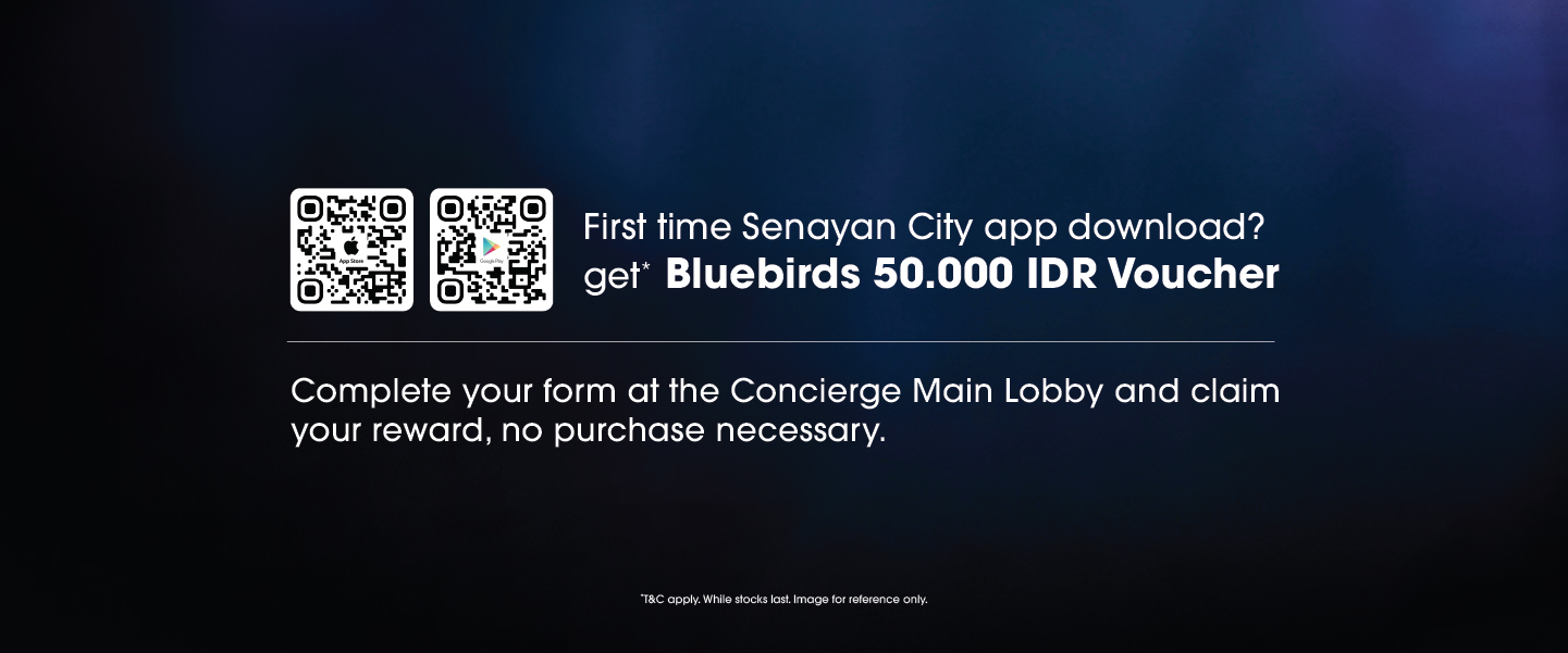 3. 200 SCX New Member pertama yang baru pertama kali download aplikasi Senayan City setiap harinya pada tanggal 13 – 31 Oktober 2025 selama periode berlangsung dan registrasi data diri ulang di Concierge tanpa min. pembelanjaan akan mendapatkan langsung hadiah voucher Bluebirds Rp 50.000,-.