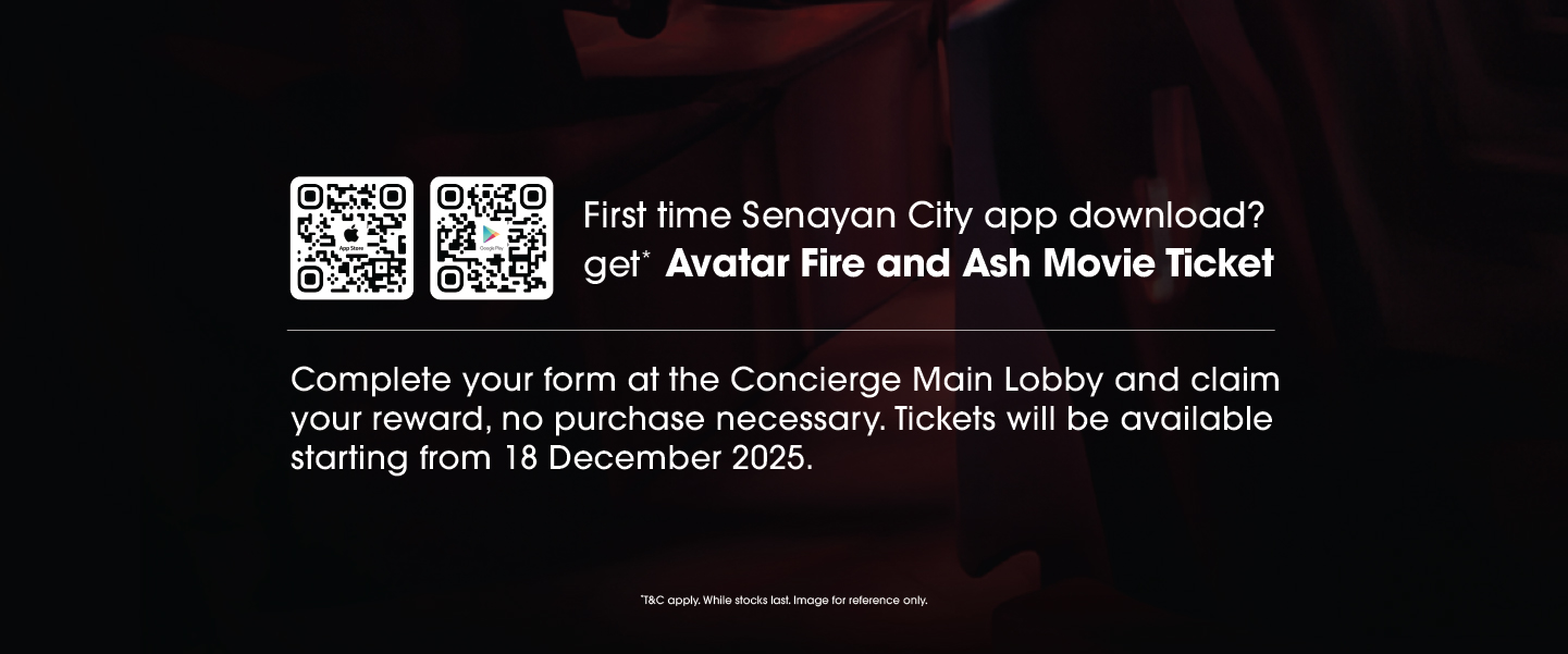 3. 100 SCX New Member pertama yang baru pertama kali download aplikasi Senayan City setiap harinya padatanggal 15 – 28 Desember 2025 selama periodeberlangsung dan registrasi data diri ulang di Concierge tanpa min. pembelanjaan akan mendapatkan langsunghadiah voucher film Avatar Fire and Ash.