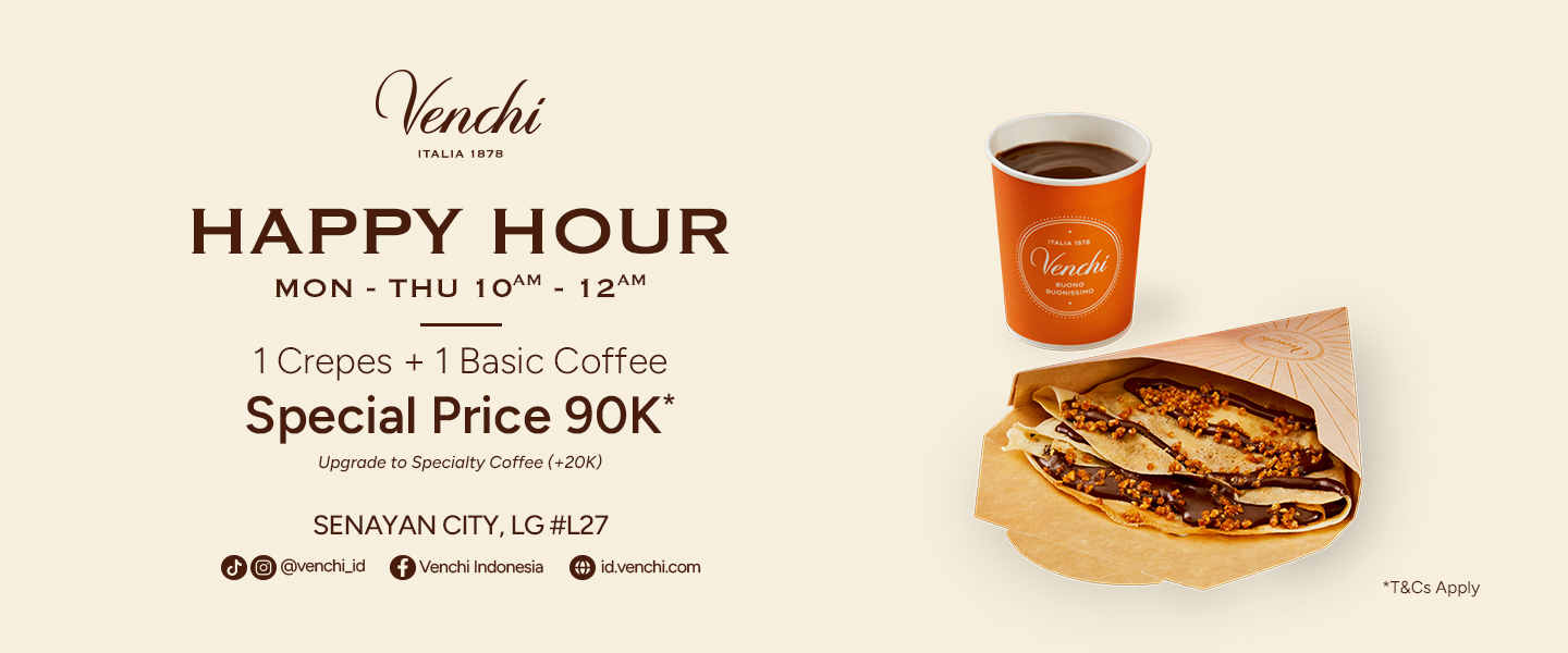 Brighten up your day with a delightful duo—1 Suprema Crepes and 1 Basic Coffee for just 90K. Craving a richer brew? Upgrade to Specialty Coffee for +20K.