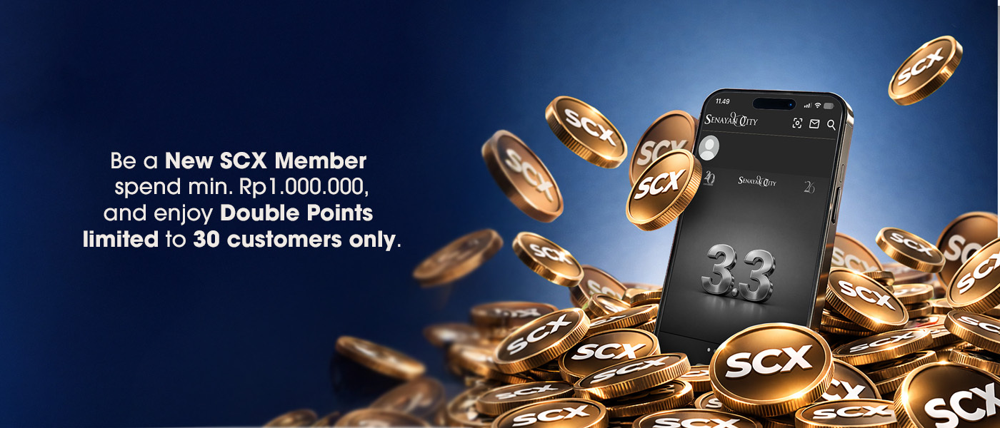 3. 30 New SCX Member terpilih yang menukarkan struk pembelanjaan di semua tenant (kecuali tenant yang tertera pada ketentuan no.4) pada tanggal 3 Maret, 4 April, 5 Mei, 6 Juni, 7 Juli, dan 8 Agustus 2026, sesuai tanggal yang tertera dengan minimal pembelanjaan senilai Rp 1.000.000,- (satu juta rupiah) dan maksimal senilai Rp 7.500.000,- ( tujuh juta lima ratus ribu rupiah ) akan mendapatkan hadiah berupa double SCX points.