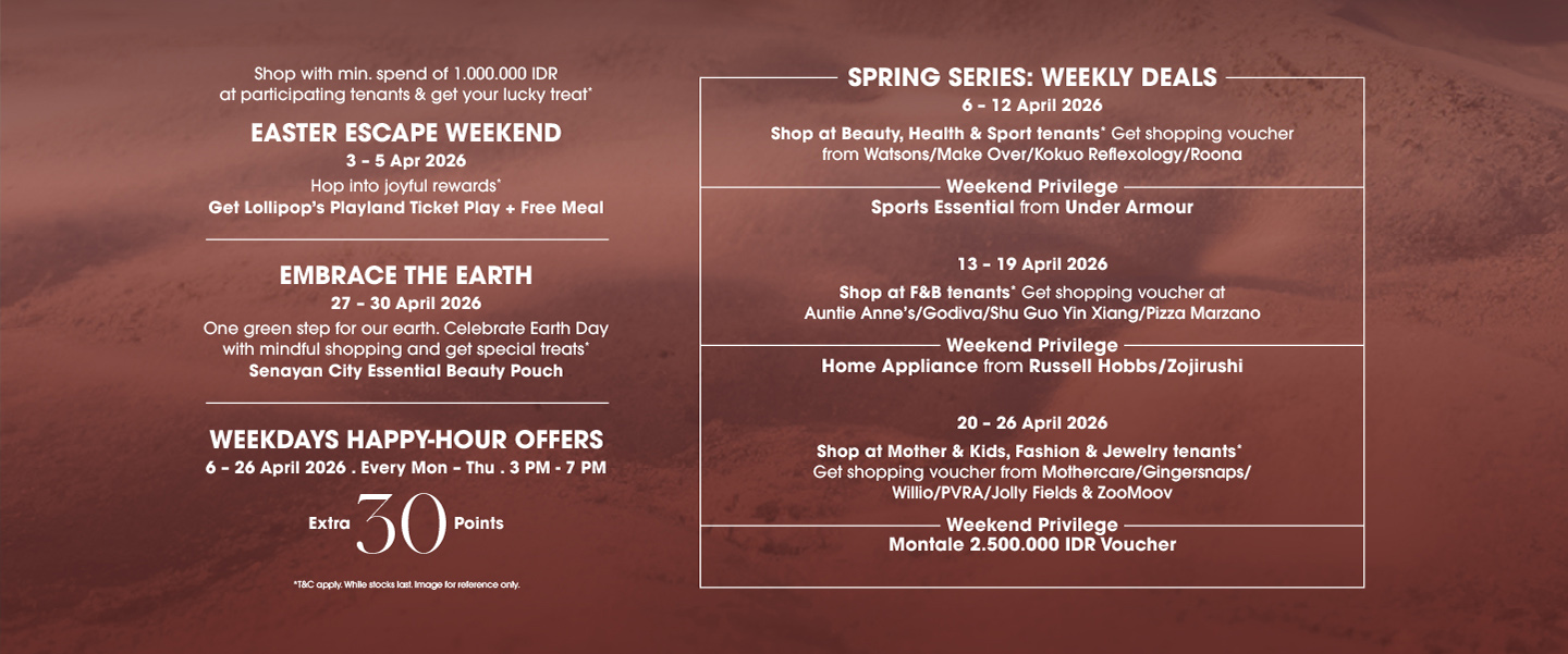 - Senayan City tidak bertanggung jawab atas kehilangan struk belanja dan hadiah.