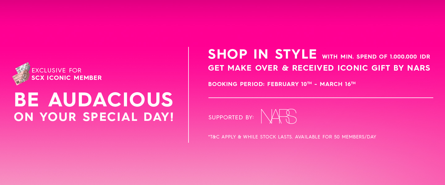 3. 50 SCX Member pertama yang menukarkan struk pembelanjaan di semua tenant (kecuali di tenant – tenant bertanda*) khusus pada tanggal 10 -16 Februari 2020 selama periode berlangsung dengan minimal senilai Rp1.000.000,- (satu juta rupiah) berkesempatan mendapatkan Make Over & Receive Iconic Gift by NARS.