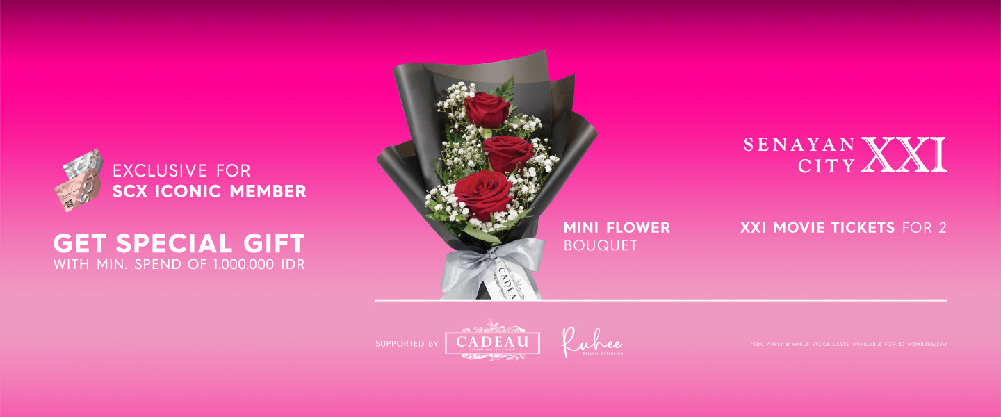 4. 50 SCX Member pertama yang menukarkan struk pembelanjaan di semua tenant (kecuali di tenant – tenant bertanda*) khusus pada tanggal 15 Februari 2020 selama periode berlangsung dengan minimal senilai Rp1.000.000,- (satu juta rupiah) berkesempatan mendapatkan Mini Flower Bouquet, 2 pcs XXI Movie Tickets (valid for everyday) dan Voucher Rp. 50.000,- by Ruhee.